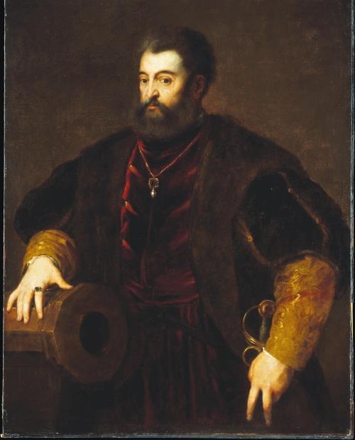 ОРИГИНАЛ ЭТОГО ПОРТРЕТА, СОЗДАННЫЙ ТИЦИАНОМ, НЕ СОХРАНИЛСЯ, ОДНАКО МЫ МОЖЕМ СУДИТЬ О НЕМ ПО НЕСКОЛЬКИМ КОПИЯМ, ИЗ КОТОРЫХ НАИБОЛЕЕ РАННЕЙ И КАЧЕСТВЕННОЙ ЯВЛЯЕТСЯ ВАРИАНТ НЕИЗВЕСТНОГО АВТОРА, ПРЕДСТАВЛЕННЫЙ В МЕТРОПОЛИТЕН-МУЗЕЕ. ЕСТЬ ВЕРСИЯ, ЧТО ИСХОДНАЯ КАРТИНА БЫЛА СОЗДАНА КАК ПАРНАЯ К ПОРТРЕТУ ЛАУРЫ ДИАНТИ И ИЗНАЧАЛЬНО ВИСЕЛА С НЕЙ РЯДОМ. ПОСЛАНИЕ, КОТОРОЕ ТРАНСЛИРУЕТ СОВРЕМЕННИКАМ ГЕРЦОГ ЭТИМ ПАРАДНЫМ ИЗОБРАЖЕНИЕМ, МОЖНО РАСШИФРОВАТЬ, ОБРАТИВ ВНИМАНИЕ НА ЕГО РУКИ – ОДНА ЕГО ЛАДОНЬ ПОКОИТСЯ НА ПУШКЕ, ДРУГАЯ – НА ЭФЕСЕ ШПАГИ.