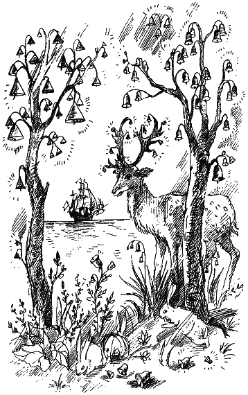 На этих цветущих островах было множество вечнозеленых деревьев. Вместо листьев на них росли зеленые колокольчики. Стройные и легкие олени, бродившие в чащах, раздвигали рогами густые ветви. И при этом их рога мелодично звенели.