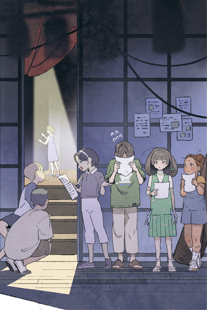 Для нашего спектакля выделили актовый зал, где обычно выступал завуч и куда приглашали важных гостей. Там сейчас проходило прослушивание. Отбирали актёров на «Летний театральный фестиваль начальной школы Мирэ». Он проводится каждый год в мае среди учеников!
