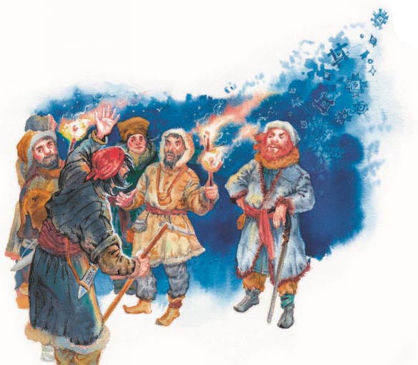 Но однажды – давно ли, недавно ли – в Тёмную страну приехал на чудесном олене большой человек. Борода его касалась колен. Когда он заговорил, глаза его засветились так, что все вежники рассмотрели его лицо. Они увидели, что лицо это красивое и мудрое. И сказал он вежникам: