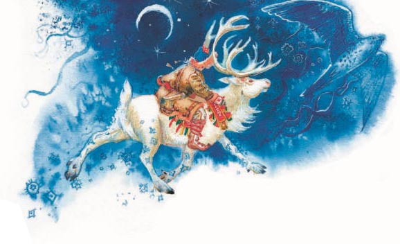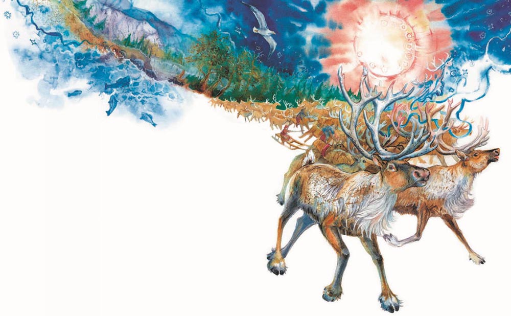 Чудесный олень коснулся солнца рогами, оно тронулось с места и плавно легло на рога всех оленей. И поехали сто тысяч вежников на ста тысячах оленей, несущих на своих рогах солнце.