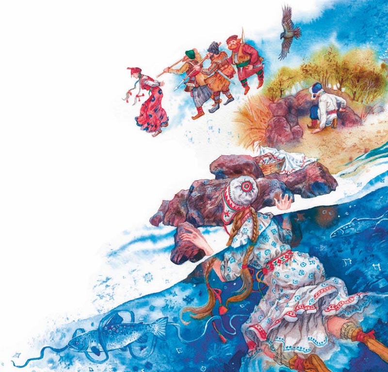 Потом рассказала: напала на остров Салма злая чудь. Кто был на острове, тот погиб. Кто не был на острове – тем и спасся. А она, жена Арипия, бельё на берегу полоскала, страшную чудь увидала – в воду бросилась и плыла, сколько могла. До острова доплыла, отлежалась, отдышалась – снова в воду бросилась, до другого берега доплыла. Едва не утонула, но весть принесла.