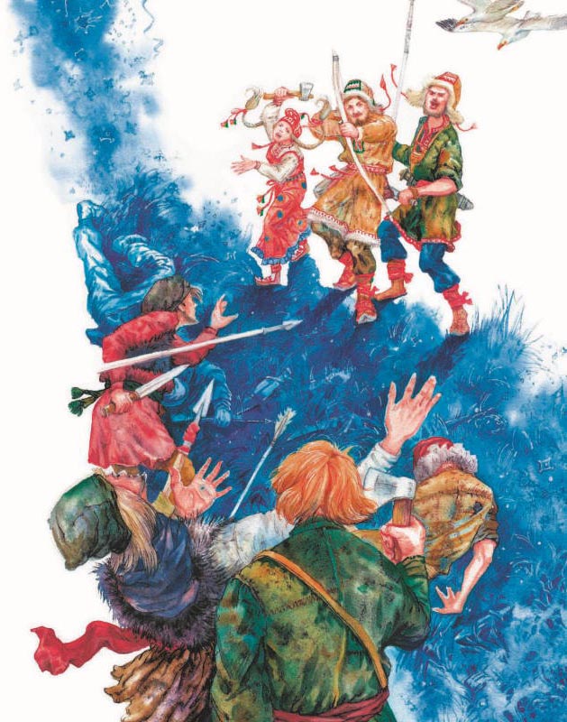 Настрелял Ляйне из лука много гагар. Нарубил Ляйне ворох кустов и вырезал целую охапку крепких стрел. И сделал он тем стрелам наконечники из гагарьих клювов. Такая стрела, пущенная богатырской рукой, насквозь врага пробивает.