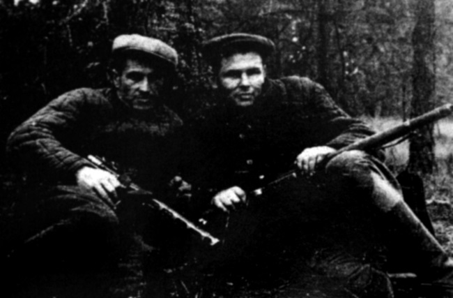 Бойцы истребительного батальона Мельник И.С. и Ковалев В.Т. на привале во время прочески Чарторийского леса