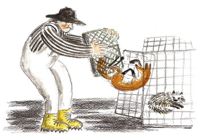 Лис поднял голову и, прищурившись, потянул носом. Запах Криволапыча усилился. Следуя за ним, лис пробрался сквозь густой, как метла, можжевельник и замер от неожиданности. На самом берегу, одним углом касаясь тёмной воды, стояла большая клетка-самолов. Она была пуста, но примятые стебли камыша указывали на то, что ещё недавно тут был пленник. В траве лежал недоеденный кусок мяса.