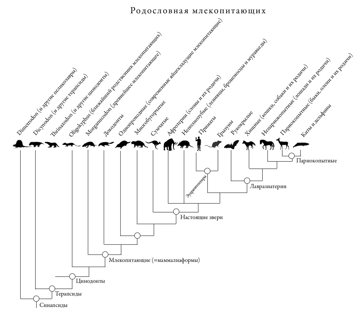 В этой книге я расскажу историю эволюции млекопитающих, какой мы ее знаем сейчас. Первая половина книги охватывает ранние стадии эволюции млекопитающих – от момента, когда они отделились от рептилий, до вымирания динозавров. В это время млекопитающие приобрели практически все свои характерные черты – шерсть, молочные железы и т. д. – и шаг за шагом трансформировались из предка, походившего на ящерицу, в тех существ, которых сегодня мы знаем как млекопитающих. Во второй части книги изложено, что происходило после того, как динозавры вымерли: как млекопитающие воспользовались случаем и заняли главенствующее положение, как они приспосабливались к постоянно менявшемуся климату, путешествовали на дрейфующих континентах и дали начало невероятному богатству современных видов: бегающих, роющих, летающих, плавающих, думающих и читающих книги. Рассказывая о млекопитающих, я хочу показать, как мы собирали эту историю по кусочкам, используя подсказки, которые дают ископаемые остатки, и дать представление о том, что значит быть палеонтологом. Я познакомлю вас с моими учителями, моими учениками и моими вдохновителями, чьи открытия позволили мне запечатлеть историю млекопитающих.