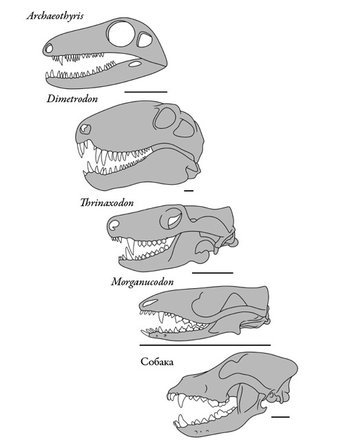 Эволюция черепов и зубов за время истории синапсид. На иллюстрации показано, как зубы усложнялись и как среди них выделялись характерные для млекопитающих резцы, клыки, предкоренные и коренные. Масштаб 3 см.