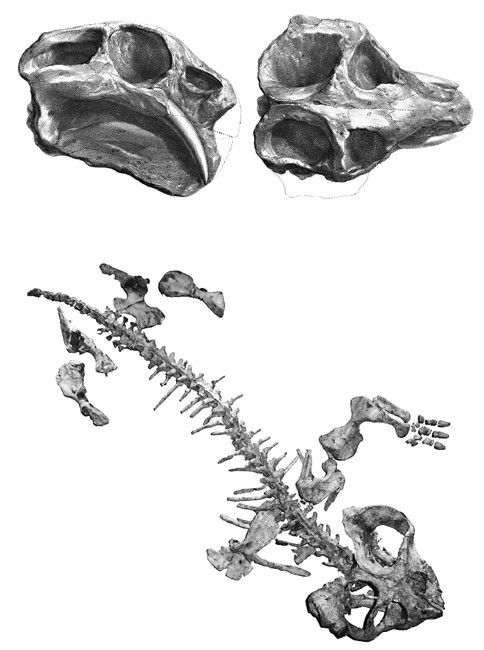 Дицинодонты, примитивные синапсидные предки млекопитающих: череп Dicynodon из монографии Ричарда Оуэна 1845 г. (вверху) и скелет (внизу).
