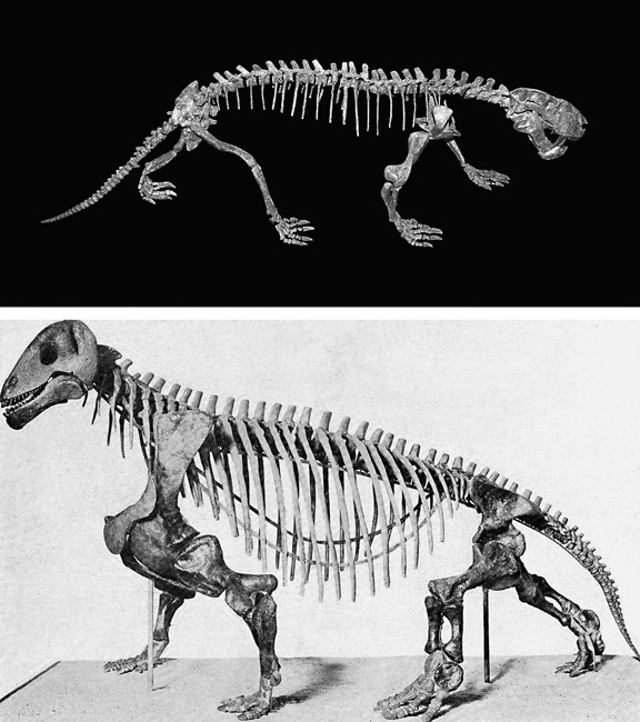 Терапсиды, примитивные синапсидные предки млекопитающих: саблезубый горгонопс (вверху) и бодучий диноцефал Moschops (внизу).