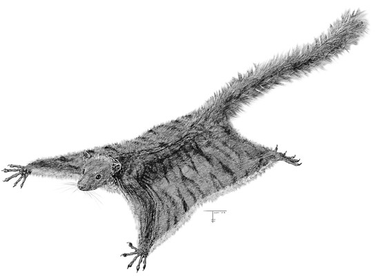 Ископаемое млекопитающее! Млекопитающее, жившее бок о бок с динозаврами в юрский период, около 160 млн лет назад. В каком-то смысле это млекопитающее отвечало стереотипу: оно было маленьким, и один из крылатых динозавров мог запросто прихлопнуть его или наступить на него. Но в другом, куда более важном смысле оно ломало шаблонные представления о юрских или меловых млекопитающих. По обе стороны позвоночника проходила перепонка, натянутая между передними и задними лапами. Совсем как у белки-летяги.