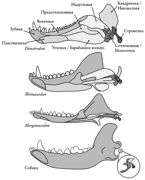 Челюстные кости, которые уменьшаются и смещаются назад, утрачивая функции закрывания рта; новый упроченный челюстной сустав, развивающийся между зубной и чешуйчатой костями… Кажется, вы об этом уже слышали? Да, именно об этом мы узнали в предыдущей главе.