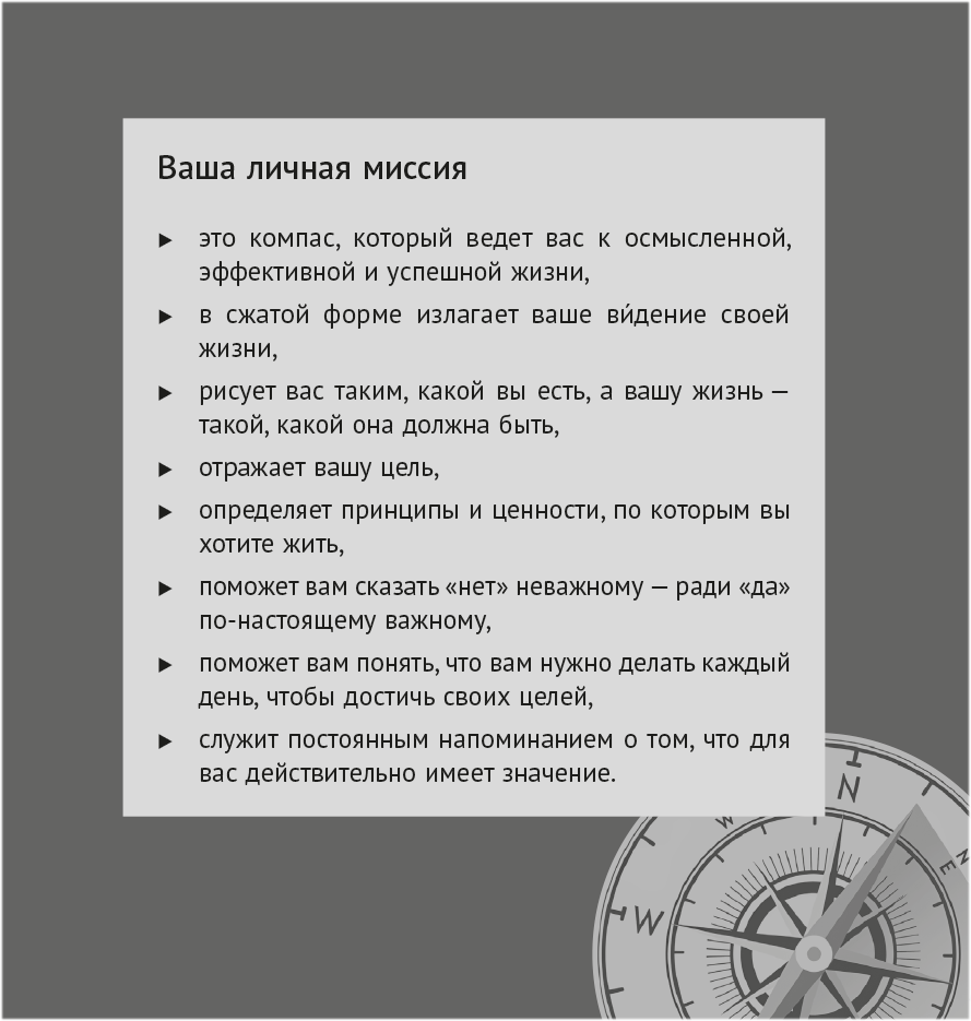 Ваши ви́дение, ценности и принципы мощнее, важнее и нужнее, чем багаж прошлого или сегодняшняя суета. Вот почему разработка личной миссии – одна из самых важных вещей в вашей жизни. Формулировка миссии определяет ваше мировоззрение, обосновывает ваши решения и дает вам ощущение точного направления. Когда вы составите ее, вы сможете действовать, а не просто реагировать на свои эмоции, внешние обстоятельства и поведение других людей. В сложных ситуациях миссия помогает выбрать проактивный, ценностно ориентированный курс действий, основанный на принципах. Одним словом:
