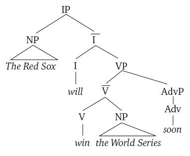 Слово will – вспомогательный глагол, функция которого заключается в выражении значения, связанного с истинностью пропозиции (как ее воспринимает говорящий). Помимо будущего времени, такими значениями являются отрицание (например, won't и doesn't), необходимость (must) и возможность (might и can). Вспомогательные глаголы обычно располагаются на периферии синтаксического дерева, отражая тот факт, что их значение распространяется на все предложение целиком. Вспомогательные глаголы являются вершиной предложения так же, как существительное является вершиной именной группы. Поскольку вспомогательные глаголы называются также infl (от inflection 'словоизменение'), мы можем называть предложение IP (inflection phrase). Позиция подлежащего зарезервирована для подлежащего всего предложения и показывает, что предложение содержит в себе утверждение: некоторый предикат (VP) является истинным в отношении этого подлежащего. Примерно так выглядит предложение в современной версии теории Хомского:
