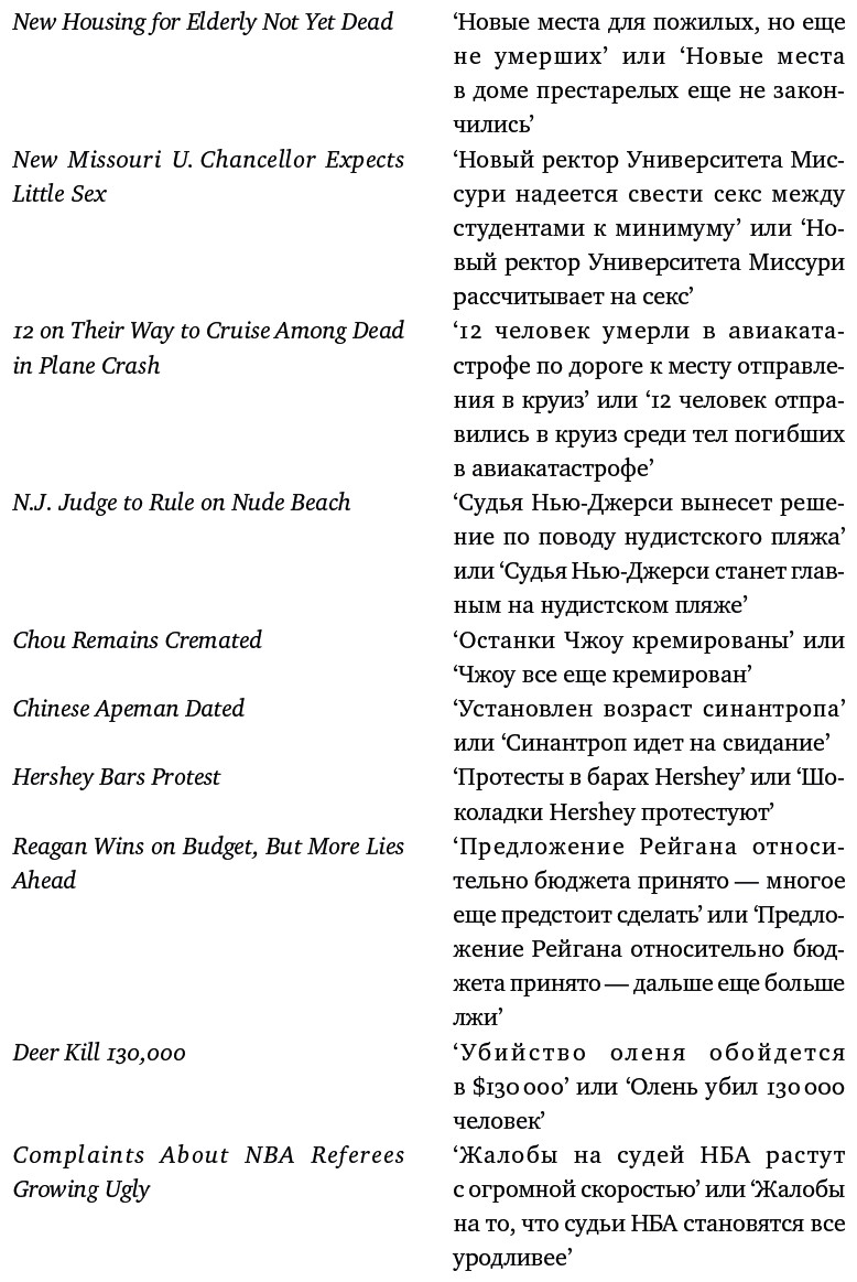 Все, кто ходит на коктейльные вечеринки, знают, что одним из главных достижений Хомского является идея «глубинной структуры», которая, подвергшись трансформации, преобразуется в «поверхностную структуру». Когда в 1960-х годах в период развития бихевиоризма Хомский ввел эти термины, это была сенсация. Термин «глубинная структура» обозначал все глубоко скрытое, универсальное, значимое, и сразу же начались разговоры о глубинных структурах визуального восприятия, рассказов, мифов, поэзии, картин, музыкальных произведений и так далее. Я вас разочарую, если скажу, что «глубинная структура» – это лишь удобный для грамматической теории инструмент. Это не значение предложения и не универсальная черта всех языков. Хотя универсальная грамматика и абстрактные фразовые структуры кажутся неотъемлемыми частями грамматической теории, многие лингвисты – включая самого Хомского в его последних работах – склонны считать, что без глубинных структур можно и обойтись. Чтобы охладить повышенный интерес к слову глубинный, лингвисты приняли обозначение D-структура (от deep structure 'глубинная структура'). Идея, лежащая в основе D-структуры, довольно проста. Вы, наверное, помните: для того чтобы предложение было грамматичным, необходимо, чтобы глагол получил все, что он хочет, – все аргументы, перечисленные в глагольном словаре, должны появиться в предписанных им синтаксических позициях. Во многих предложениях, однако, не все требования глагола удовлетворяются. Глагол put 'поставить' требует подлежащего, дополнения и предложной группы: предложения he put the car 'он поставил машину' и he put in the garage 'он поставил в гараж' кажутся неполными. Как тогда мы можем объяснить грамматичность следующих предложений?