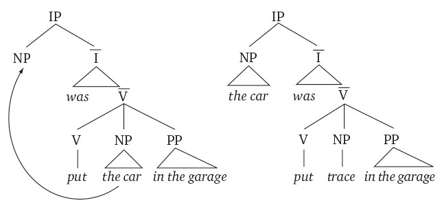 В глубинной структуре слева NP the car расположена там, где ее хотел бы видеть глагол; в поверхностной структуре справа она расположена там, где мы действительно ее слышим. В поверхностной структуре позиция, из которой фразовая составляющая переместилась, содержит непроизносимый символ, оставшийся после передвижения, – он называется след (trace). След служит для обозначения роли перемещенного аргумента и помогает нам понять, что происходило с машиной в описываемом событии: мы можем посмотреть, какое значение имеет дополнение при глаголе put, и мы увидим, что это то, что поставили. Благодаря наличию следа поверхностная структура содержит всю информацию, необходимую для понимания смысла предложения, а исходная глубинная структура, которая была нужна только для того, что поместить слова из ментального лексикона в предложение, не играет никакой роли.