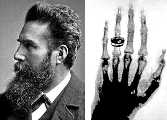 8 ноября 1895 года Вильгельм Рентген, профессор физики из Вюрцбургского университета, совершенно случайно открыл рентгеновские лучи. Неведомое излучение из катодной трубки могло проходить через ткани и оставлять изображение на фотопластинке. Первым рентгеновским снимком стал снимок кисти супруги физика с обручальным кольцом, сделанный 22 декабря 1895 года. Это открытие оказало большое влияние на мир медицины, и Рентген получил Нобелевскую премию.