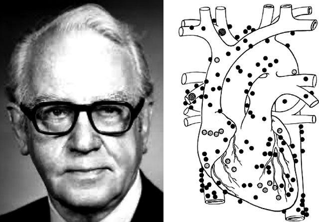 Рисунок 1.6: А. Дуайт Харкен. Б. Схема из публикации Харкена с указанием месторасположения пуль и осколков, удаленных из груди раненых солдат.