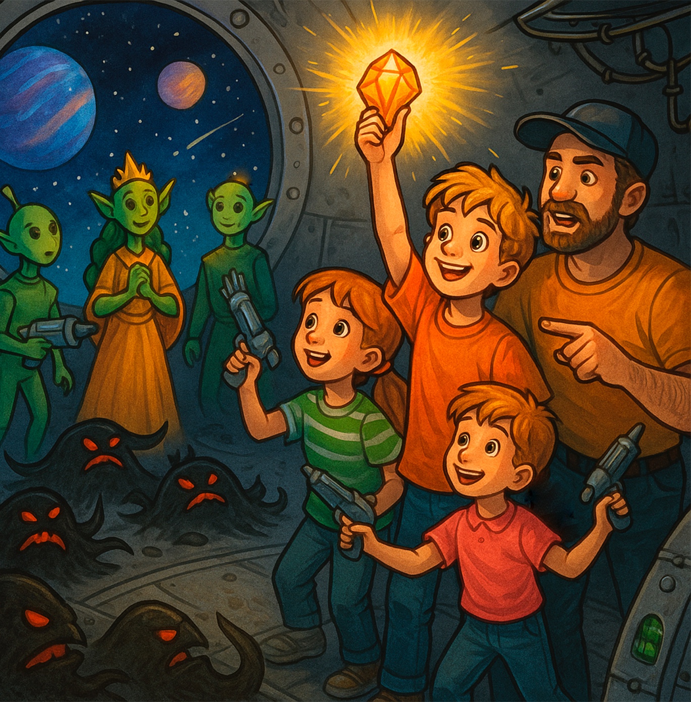 Так не хотелось детям возвращаться, им так понравилось путешествие, но родителей они любили и не хотели расстраивать. Все загрузились в космический корабль и полетели домой.