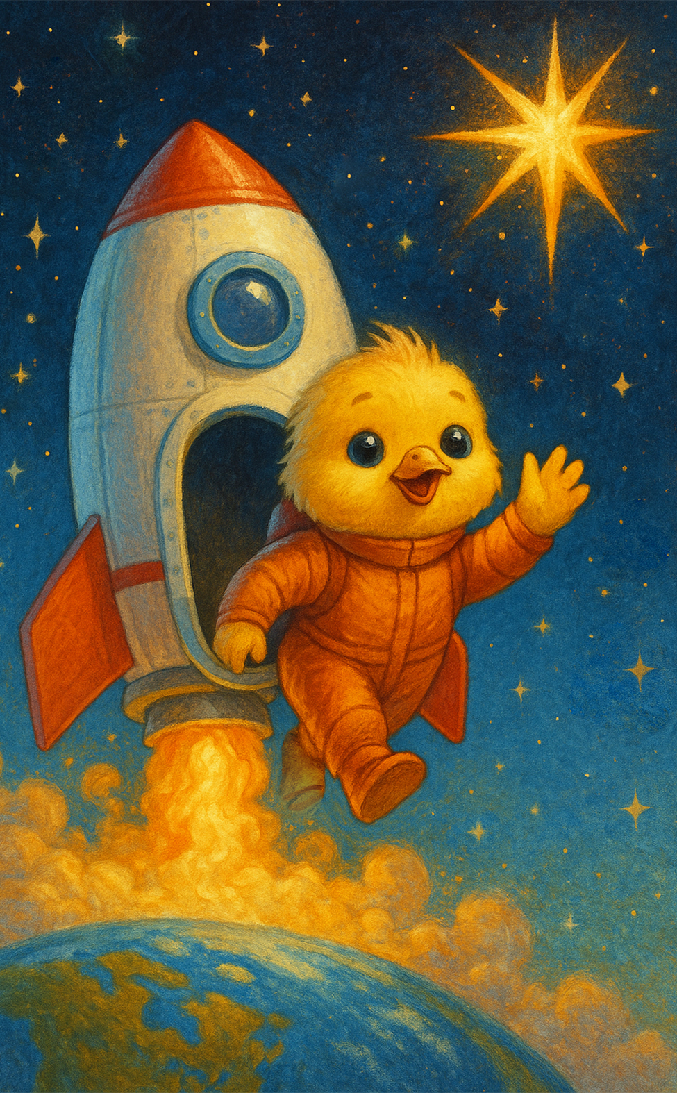 На следующее утро Дружок рассказал об этом родителям, и те решили помочь ему осуществить мечту. Они всем семейством построили для птенца специальную ракету, и однажды утром Дружок отправился в космос.
