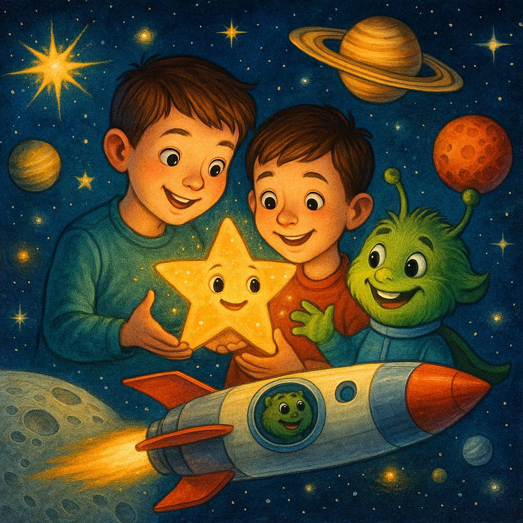 Однажды поздним вечером мальчики увидели падающую звезду. Она упала около большого дуба. Ребятам стало интересно, что произошло, и они отправились на её поиски. Подойдя ближе, мальчики заметили маленького зверька. У него была большая улыбка и добрые глаза. Загадочный зверёк сказал, что зовут его Космик.
