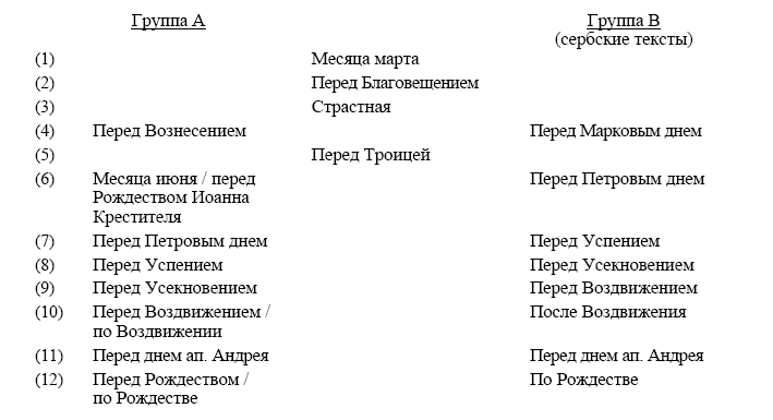 Наличие двух групп элевфериевских текстов подтверждается также составом и порядком следования библейских событий, приуроченных к каждой пятнице. Так, все тексты группы А для десятой (воздвиженской) пятницы приводят: «раздали Моисей море жезломь», а в связи с четвертой (вознесенской) пятницей сообщают: «потоплень бысть Содомь и Гоморь», тогда как в группе В оба эти события приурочены к двум Воздвиженским пятницам: перед Воздвижением «потоплен бысть Содомь и Гоморь», после Воздвижения – «раздали Моисей море жезломь», а к пятнице, стоящей на четвертом месте, перед Марковым днем (в текстах группы А – перед Вознесением), отнесены события, приписываемые в группе А следующей, пятой пятнице (перед Пятидесятницей): «плѣнише Агаряне Иерусалимь». Единственный русский текст группы В, опубликованный Тихонравовым [Тихонравов 1863: 335–336], который Веселовский считал образцом типа В, в действительности сильно отклоняется от пяти сербских списков этой группы, имеющих очень близкую структуру и в календарном перечне, и в последовательности библейских событий.