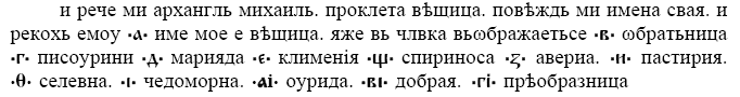 Ну, будем говорити деўйать питань… Шчо йи йиден? – Той відповідайи, кажи: Йиден так йак ньіц. – А він питайи сьи: А шчо йи два? – Той кажи: Два хлопцьі то йи добра компаньійа (а ґазда спит, ньіц ни знайи). – Питайи сьи дальі: Шчо йи три? – А він кажи: Три хлопцьі добри бйи. – Питайи йиго: Шчо йи штири? – А він кажи: «Штири колесьі, добрий віз. – Питайи йиго: Шчо йи пйить? – Той кажи: Пйить дьівок, то йи свойі вичирницьі. – Питайи йиго: Шчо йи шість? – А він кажи: Шісьть вольіў йи свій плуг. – Питайи йиго: Шчо йи сьім? – Кажи, жи сьім хлопцьiў, то йи свойа віна. – Питайи йиго: Шчо йи вісьім? – А він кажи, шчо вісьім оборогіў, то йи свій хльіб. – Питайи йиго: Шчо йи деўйить? – А він кажи: Йа диўйитий ангел віт Бога, а ти, чорти, шчизай гет [там же: 206].