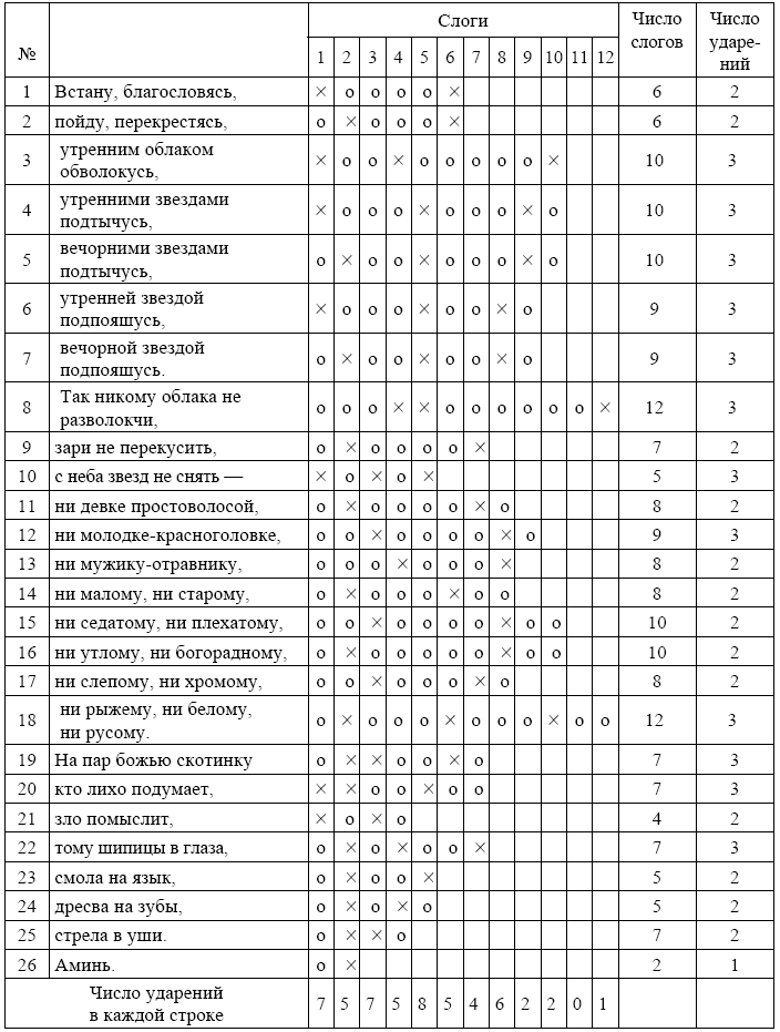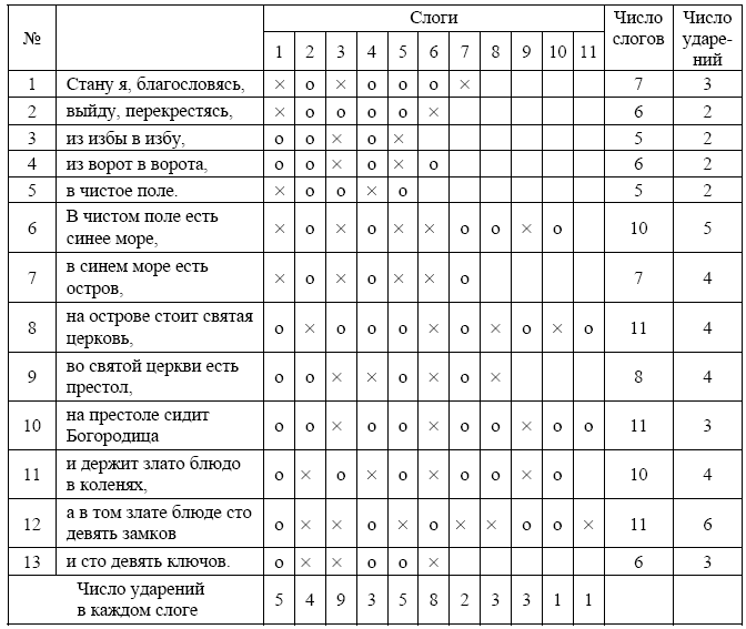 Синтаксис прозаического нарратива позволяет здесь обойтись без повторений, например: «…Пойду… в чистое поле. Там есть синее море, на нем остров, где стоит святая церковь, в ней престол, на котором сидит Богородица и держит злато блюдо в коленях, в нем сто девять замков…». Помимо цепевидной конструкции, скрепляющей весь фрагмент текста, здесь, как и в предыдущем примере, поэтическая структура текста включает грамматический и метрический параллелизм. Строки 1–2 состоят из одинаковых сочетаний личной формы глагола и деепричастия, которые оба четырехсложны, конечноударны и связаны рифмой, а первая строка, будучи началом всего текста, как это часто бывает, дополнительно маркирована местоимением я и лишним слогом. Строки 3–4 представляют собой тавтологические (изба – изба, ворота – ворота) конструкции с одинаковыми предлогами (из – в, из – в) и метрически параллельные (ударение на третьем и пятом слогах). Строка 5, семантически и синтаксически завершающая начальный блок текста и одновременно начинающая следующий, отмечена иной метрикой (ударные слоги – первый и четвертый) и иной структурой: атрибутивная конструкция с препозицией определения (чистое поле) будет далее повторяться во всех строках (чистое поле – синее море – святая церковь – злато блюдо); она перебивается дважды: остров в 7-й и 8-й строках и престол в 9-й и 10-й строках оставлены без определения, что также создает своего рода рисунок, образуемый чередующимися прилагательными и существительными: AS-AS-AS-S-S-AS-AS-S-S-AS-AS-S-S, где А – атрибутив, S – субстантив. Строки 6–9 репрезентируют одну и ту же конструкцию: на/в Х есть/стоит Y; в ритмическом отношении созвучны строки 6 и 7 (ударные слоги – первый, третий, шестой) и в меньшей степени 9 и 10 (ударные слоги – третий и девятый, промежуточные ударения не совпадают), остальные строки (8, 11, 12, 13) не обнаруживают параллелизма. В целом, однако, ритмическую структуру всего фрагмента текста (с учетом условности разбиения на строки и не всегда надежных словесных акцентов) нельзя признать совершенно свободной, ср. место ударных слогов (выделены знаком «х»); см. таблицу 1.