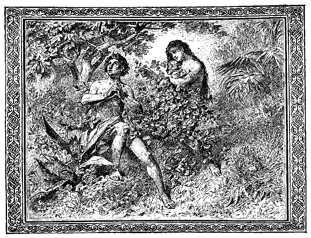 Адам и Ева поселились в раю. Они не знали там ни холода, ни голода, ни горя. Вокруг них между зверями и животными царили мир и согласие, и они не обижали друг друга. Хищный волк пасся рядом с овечкой, и кровожадный тигр отдыхал по соседству с коровушкой. Все они ласкались к Адаму и Еве и повиновались им, а птички садились к ним на плечи и распевали песенки.