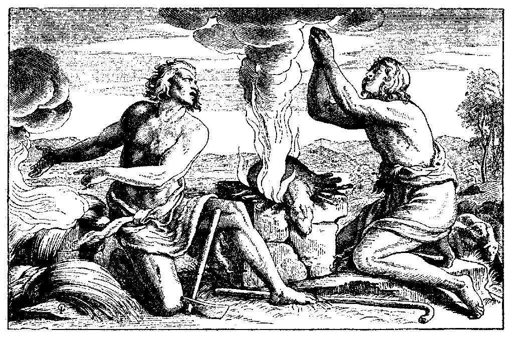 Однажды братья пожелали принести что-нибудь в жертву, или в дар, Богу. Они сложили два костра, и Каин посыпал на свой костёр хлебных зёрен, а Авель положил ягнёнка, и оба зажгли свои костры.