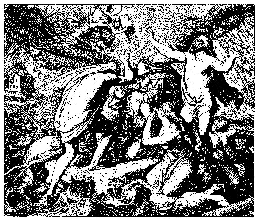 Когда корабль был готов, начался проливной дождь. Сорок дней и сорок ночей продолжался ливень. Люди и звери взбирались на деревья, на вершины гор и скал, матери поднимали своих малюток из воды; вся земля огласилась неслыханным криком и воплями. А дождь всё лил и лил как из ведра, и наконец всё умолкло, всё потонуло, и даже высочайшие горы покрылись водой.