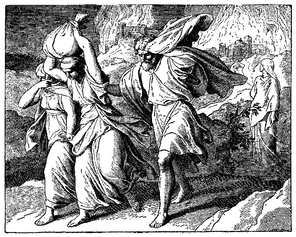 Но даже и десяти добродетельных людей не оказалось в двух городах. Тогда ангелы Божии вывели из этих городов Лота с семейством и велели им скорее уходить и не оглядываться назад. Однако жена Лота не послушалась. Она оглянулась и вдруг за непослушание и любопытство тотчас превратилась в каменный столб. На города Содом и Гомор упал с неба огонь, и оба города сгорели со всеми людьми.