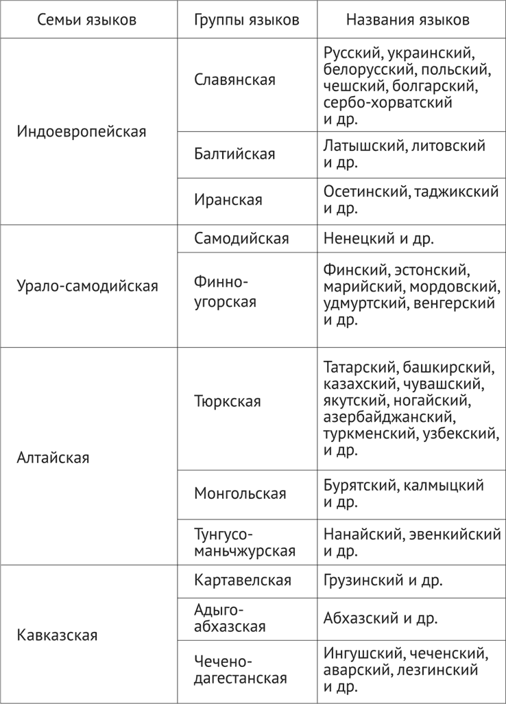 Родство народов сейчас принято определять по языку. Похожие языки ученые объединяют в языковые группы, а схожие языковые группы – в языковые семьи. Т. е. народы, языки которых принадлежат одной языковой семье, имеют общее древнее происхождение, происходят от какого-то одного древнего народа. Итак, большая часть народов Евразийского пространства разговаривают на языках, принадлежащих к четырем языковым семьям: индоевропейской, уральской, алтайской и кавказской20. Вот таблица из школьного учебника истории, в которой приведены некоторые языки этих семей: