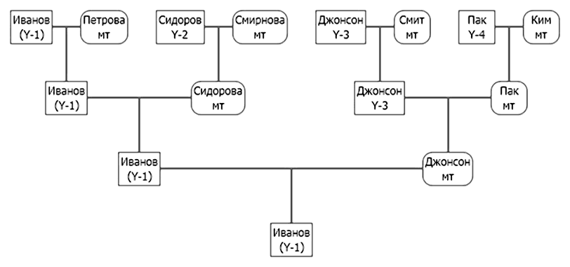 В данной схеме я наглядно покажу, как передаётся мужская Y-хромосома. Знаком Y (Y-хромосома) я обозначил мужчин, а буквами мт (митохондриальная ДНК) – женщин. У мужчин нет митохондриальной ДНК, а у женщин – Y-хромосомы.