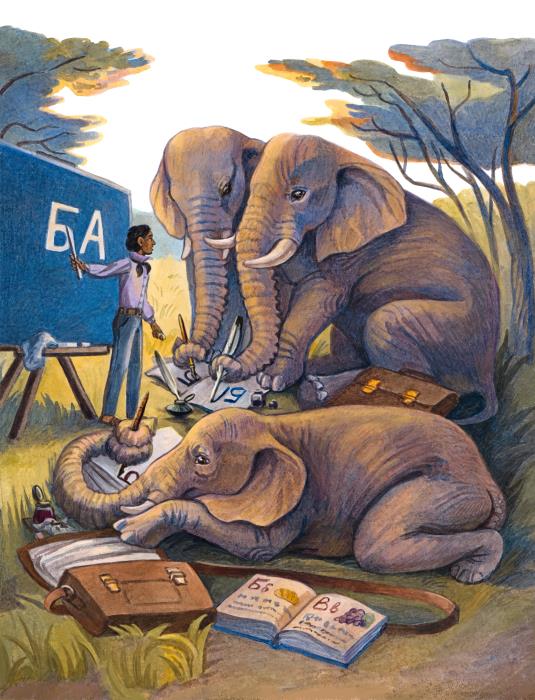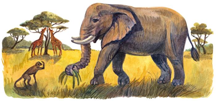 Он сказал это себе и вдруг увидел, что на краю саванны (а саванной называется африканская степь с редкими деревьями), тоже под деревом, но не под большим, а под маленьким, стоит крохотный слоник.