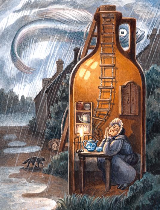 Старушка вернулась домой и, уже когда лезла по лестнице к себе в бутылку, подумала, что, пожалуй, лучше бы ей иметь обыкновенный дом с крыльцом и дверью. Пошёл дождь, старушка закрыла горлышко бутылки пробкой и снова подумала, что крыша была бы удобнее. Она всё время думала теперь о доме и наконец решила, что надо идти на озеро.