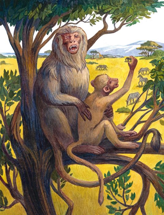 Жила-была семья обезьян-бабуинов: папа-бабуин, мама-бабуиниха и их маленький сын. Однажды в полдень (а надо сказать, что в полдень почти все животные Африки отдыхают) они забрались в тень под большое дерево-баобаб. И когда они хорошенько устроились и даже с часок подремали, маленький бабуин вдруг спросил: