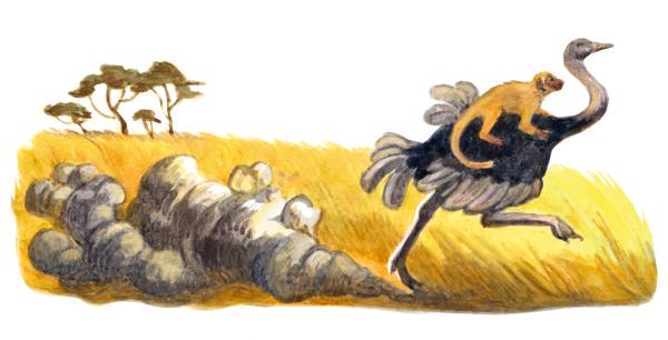 – Откуда ты, малыш? – ласково спросил страус. – Тебе ещё рано бродить одному по саванне. Садись на меня верхом, я недавно видел твоих родителей, они сидели вон под тем баобабом. Видишь, каким он кажется отсюда маленьким? Это оттого, что он далеко… Держись крепче!