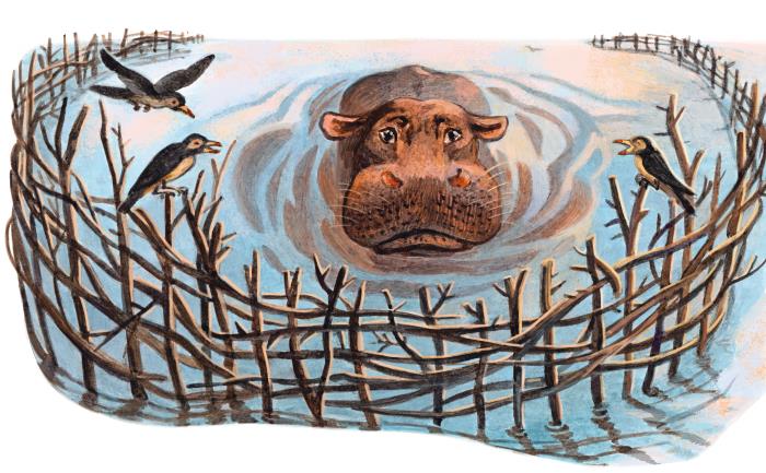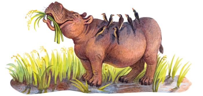 Как люди обиделись на бегемота ХугоВсё шло бы хорошо, мои дети, если бы бегемот Хуго питался рыбой, подобно акулам, или жуками и бабочками, подобно тем чёрным сорокам, которые имеют обыкновение разъезжать верхом на слонах.