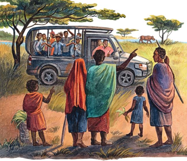 Он вернулся в лагуну и заметил, что на её берегах мелькают белые рубахи и белые блузки, зелёные юбки, и синие брюки школьников. Тут и там поднимались серые палатки. Школьники из Дар-эс-Салама приехали и строили себе лагерь.