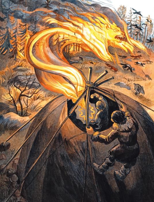 А пламя уже близко. Трудно бежать Малеятовиту в одежде из собачьих шкур. Сбросил он парку. А парка залаяла и как кинется на огонь. Кусает его, рвёт. Задержала огонь.