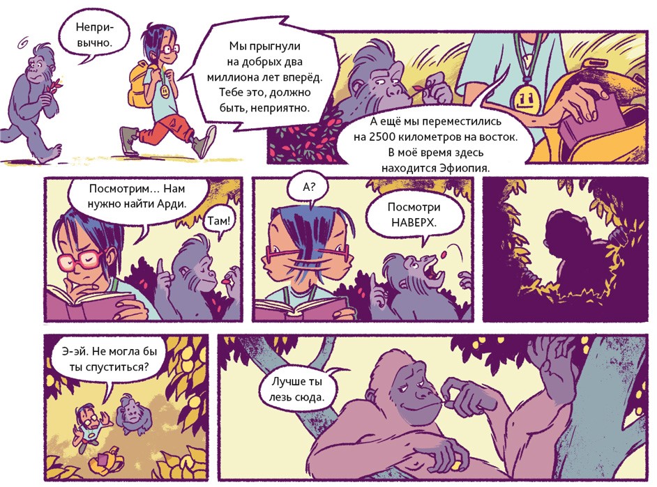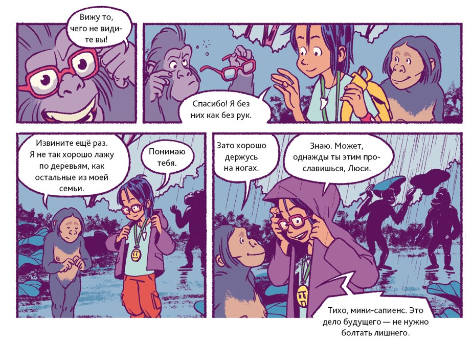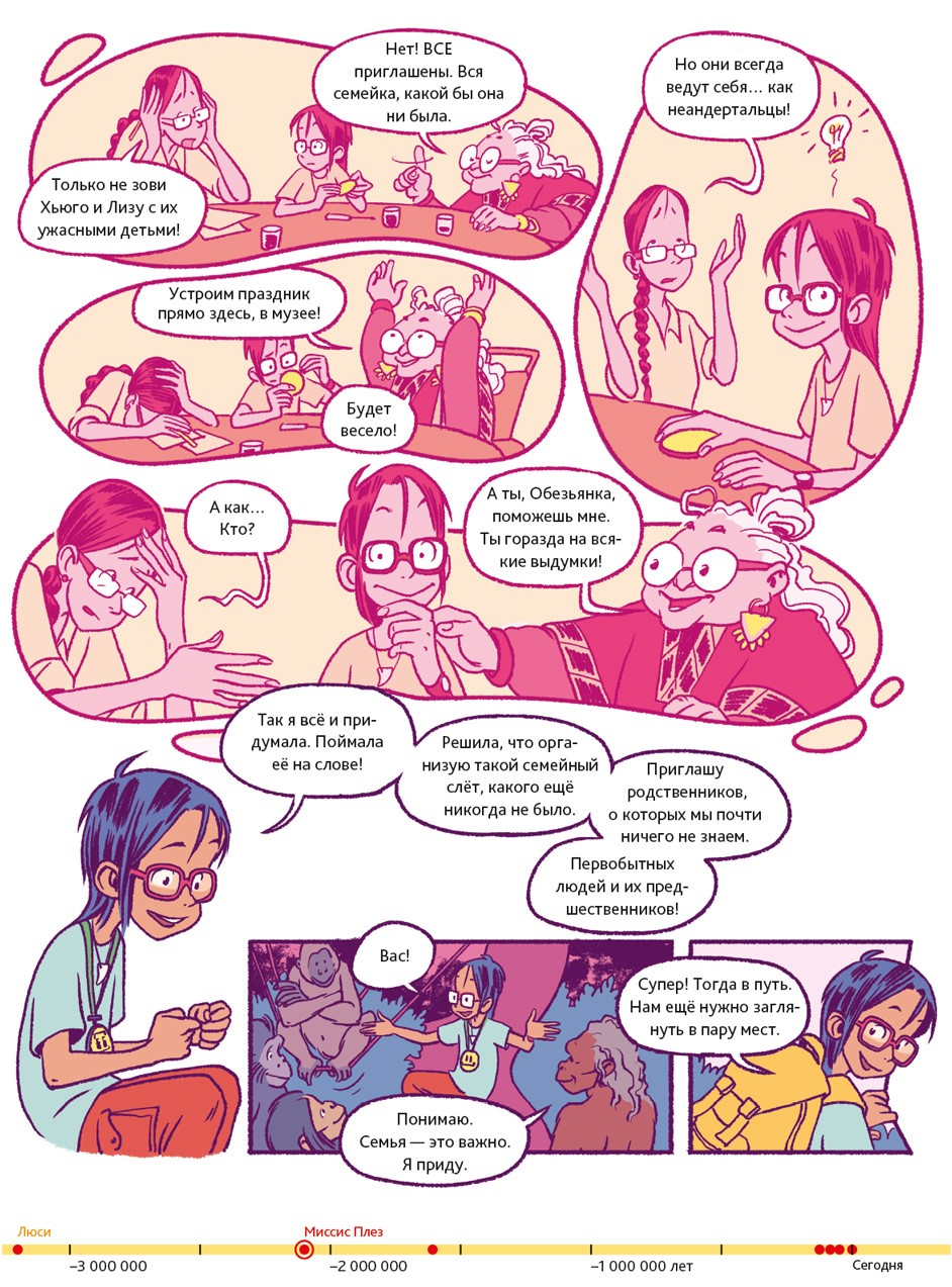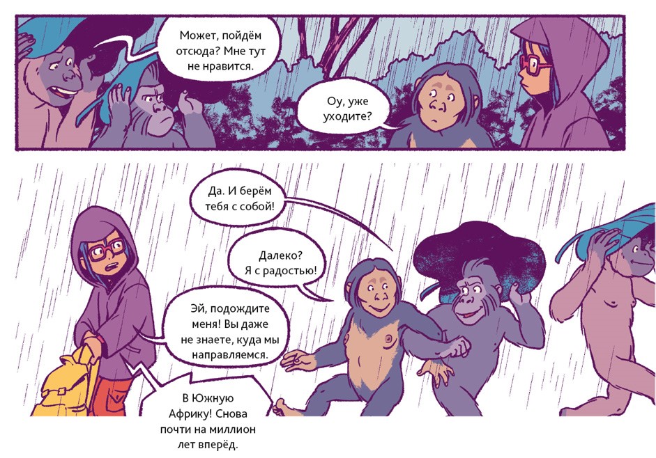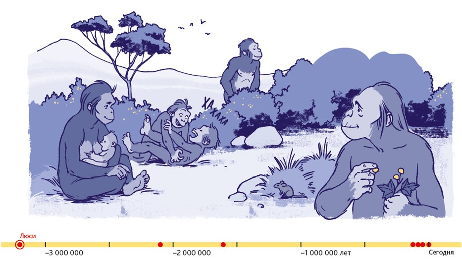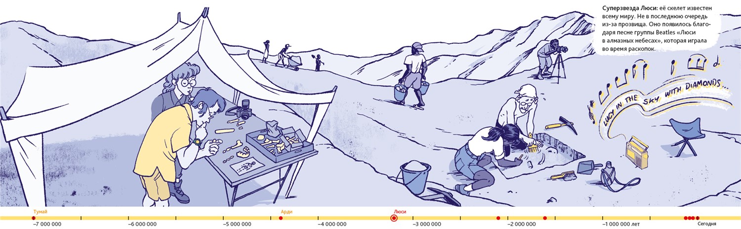 Люди – животные социальные. В подавляющем большинстве они живут семьями или крупными общинами. Так было всегда. Об этом свидетельствуют два знаменитых места археологических раскопок. Одно из них находится в Восточной Африке, на территории современной Танзании. 3,6 миллиона лет назад там произошло извержение вулкана. Когда спустя несколько дней пепел остыл, группа доисторических людей, проходя, оставила на нём свои следы. В общей сложности до нашего времени сохранилось 70 отпечатков стоп. Предположительно, эти люди принадлежали к тому же виду, что и Люси из нашего комикса.
