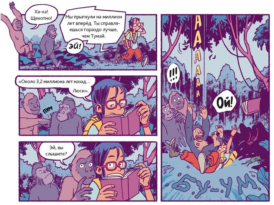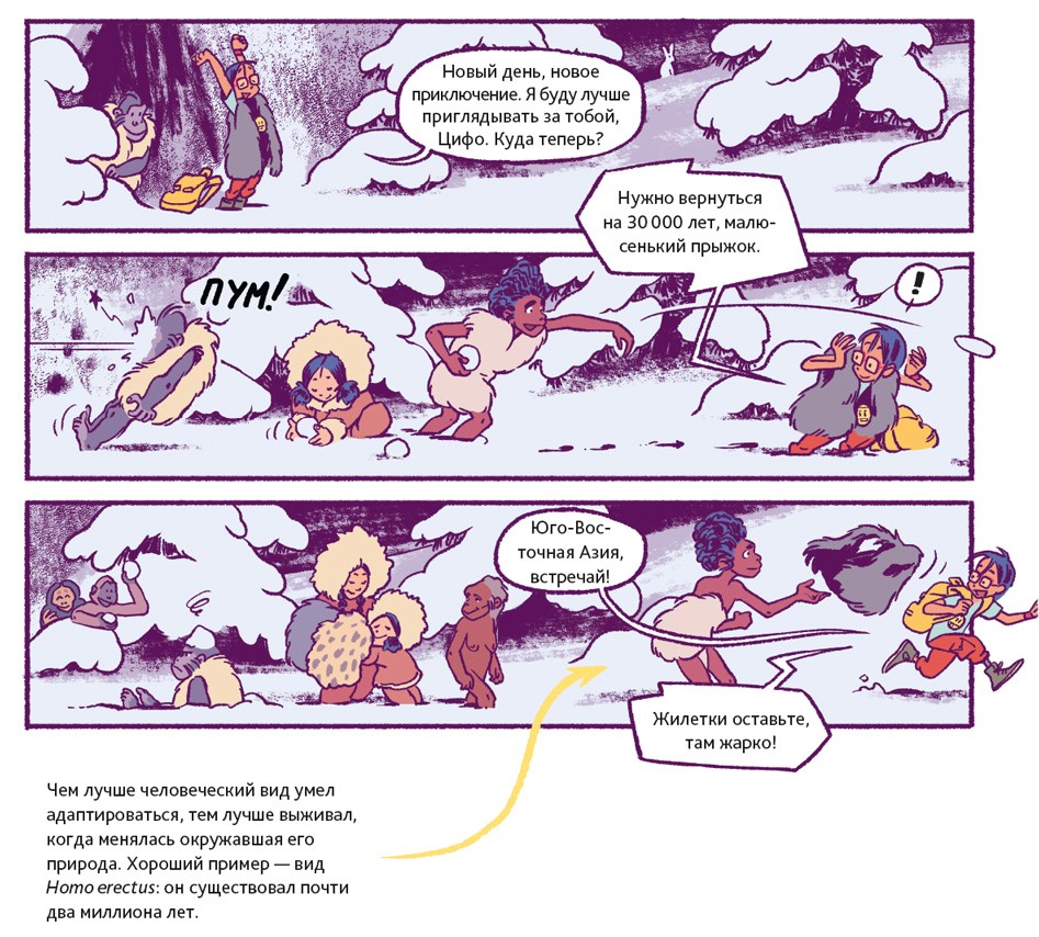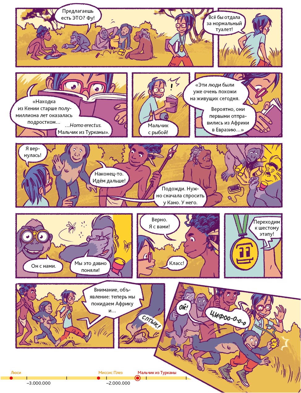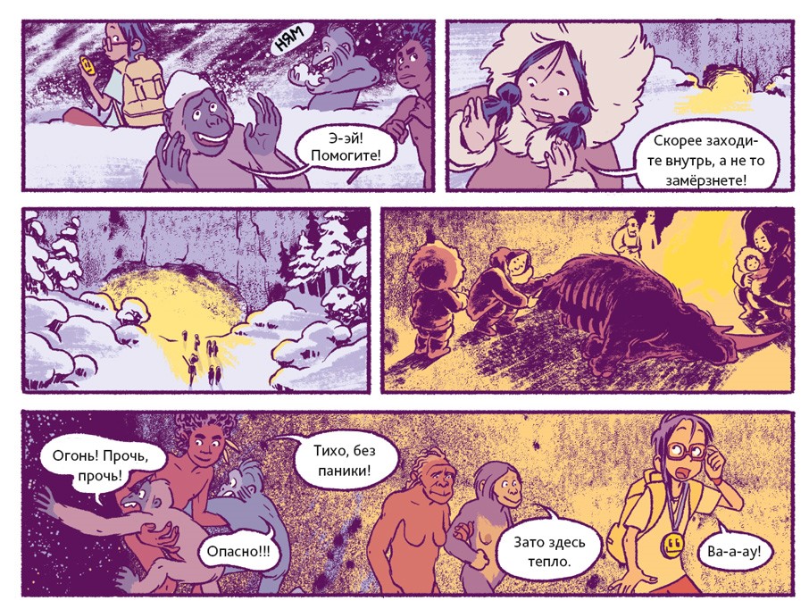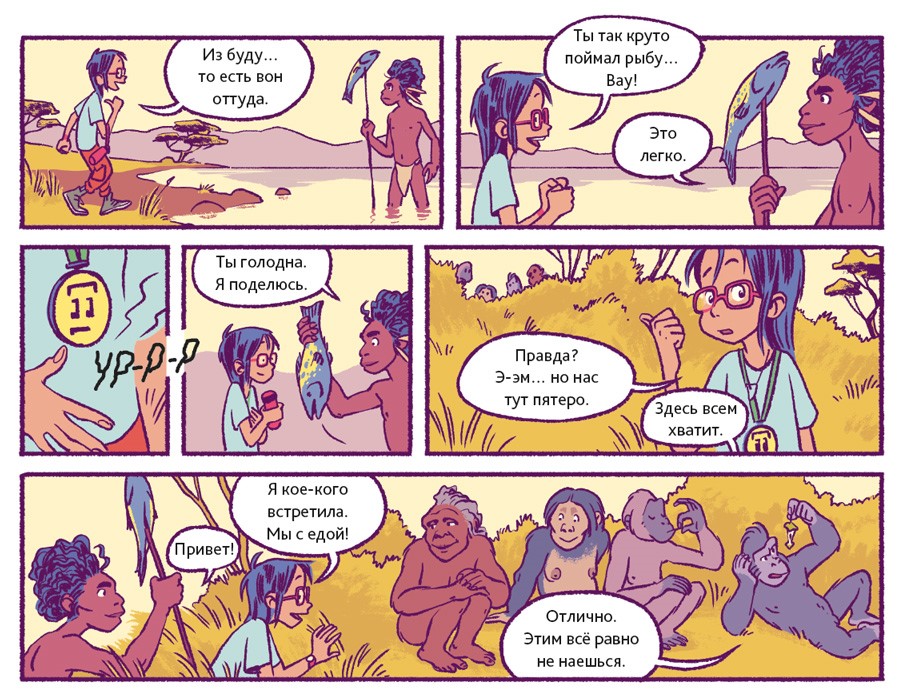 Люди – животные социальные. В подавляющем большинстве они живут семьями или крупными общинами. Так было всегда. Об этом свидетельствуют два знаменитых места археологических раскопок. Одно из них находится в Восточной Африке, на территории современной Танзании. 3,6 миллиона лет назад там произошло извержение вулкана. Когда спустя несколько дней пепел остыл, группа доисторических людей, проходя, оставила на нём свои следы. В общей сложности до нашего времени сохранилось 70 отпечатков стоп. Предположительно, эти люди принадлежали к тому же виду, что и Люси из нашего комикса.