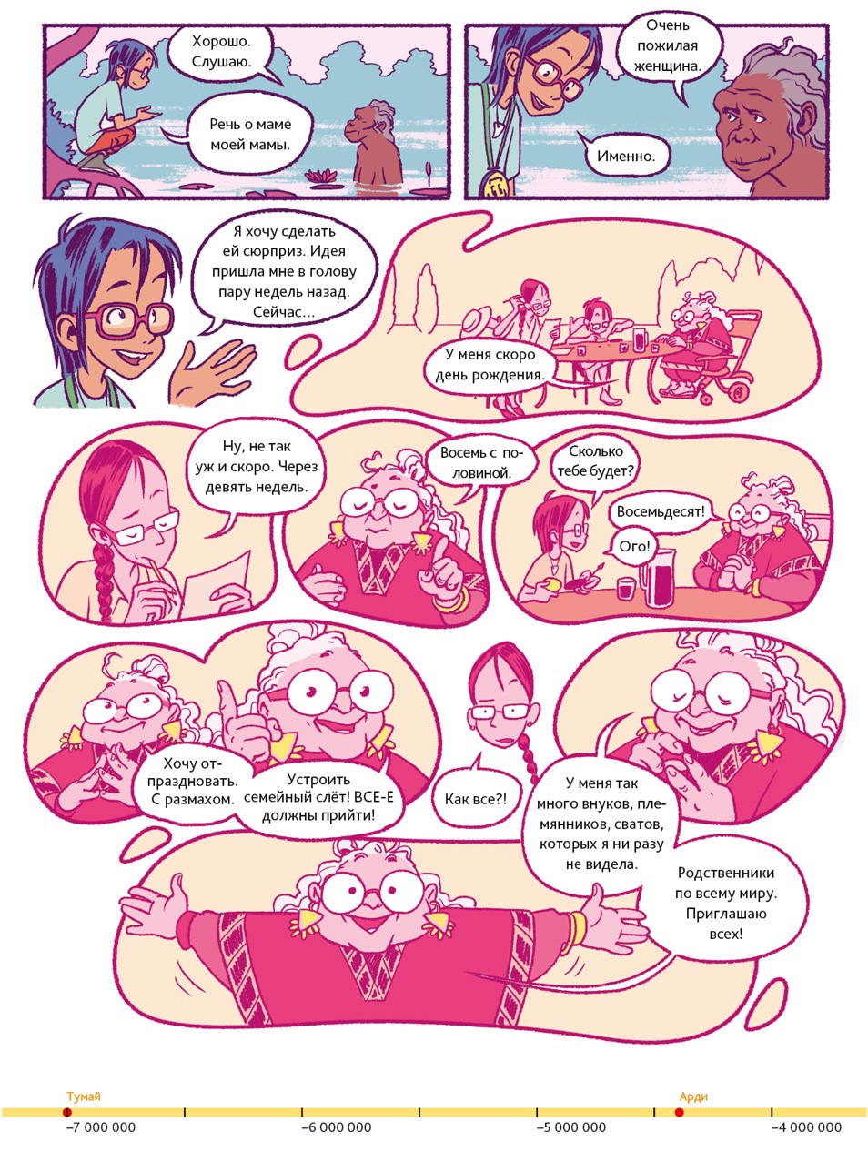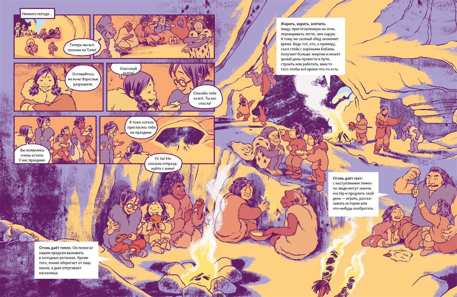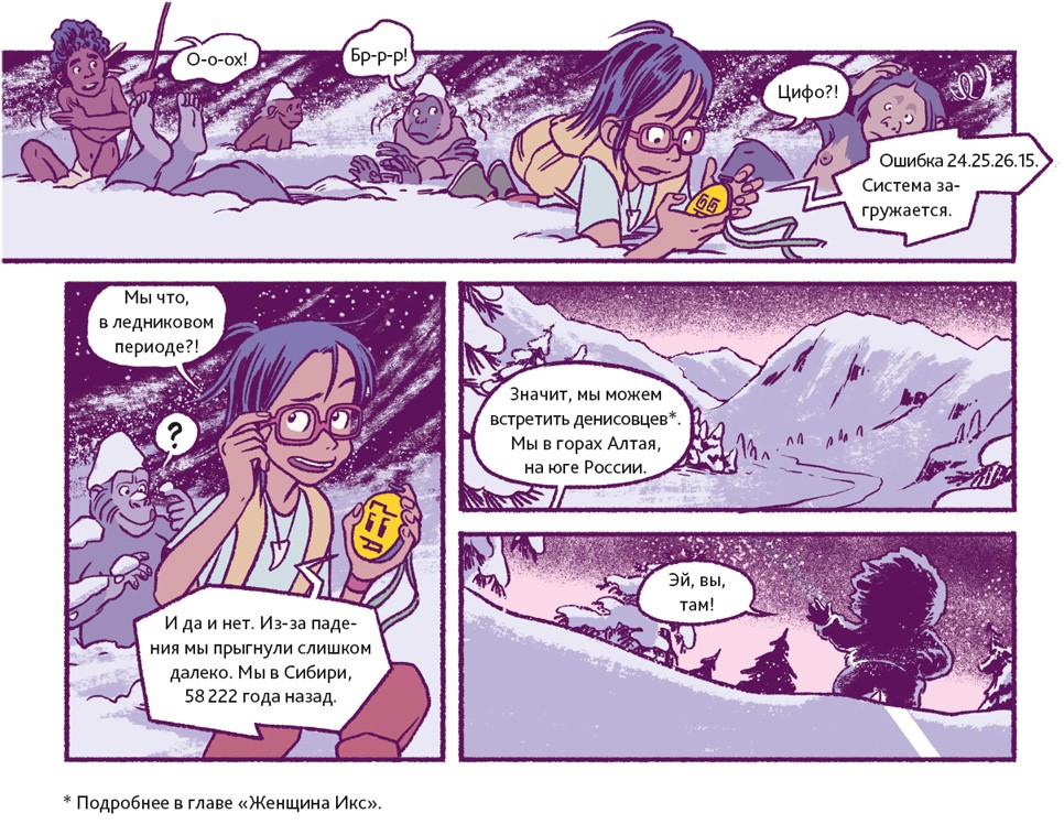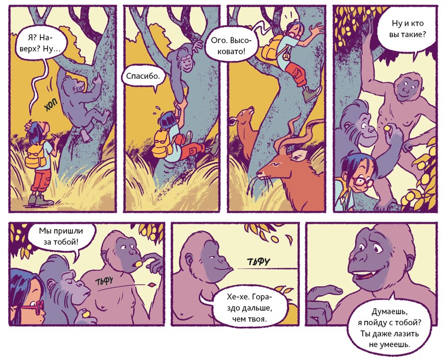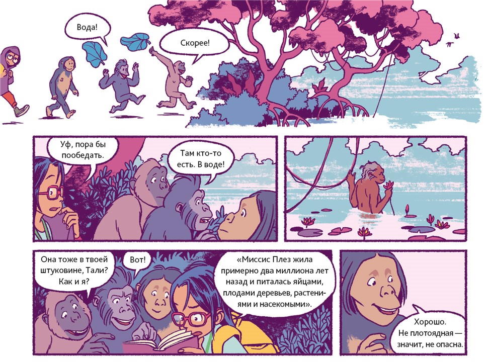 Люди – животные социальные. В подавляющем большинстве они живут семьями или крупными общинами. Так было всегда. Об этом свидетельствуют два знаменитых места археологических раскопок. Одно из них находится в Восточной Африке, на территории современной Танзании. 3,6 миллиона лет назад там произошло извержение вулкана. Когда спустя несколько дней пепел остыл, группа доисторических людей, проходя, оставила на нём свои следы. В общей сложности до нашего времени сохранилось 70 отпечатков стоп. Предположительно, эти люди принадлежали к тому же виду, что и Люси из нашего комикса.