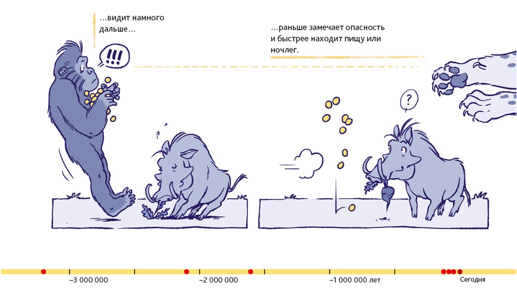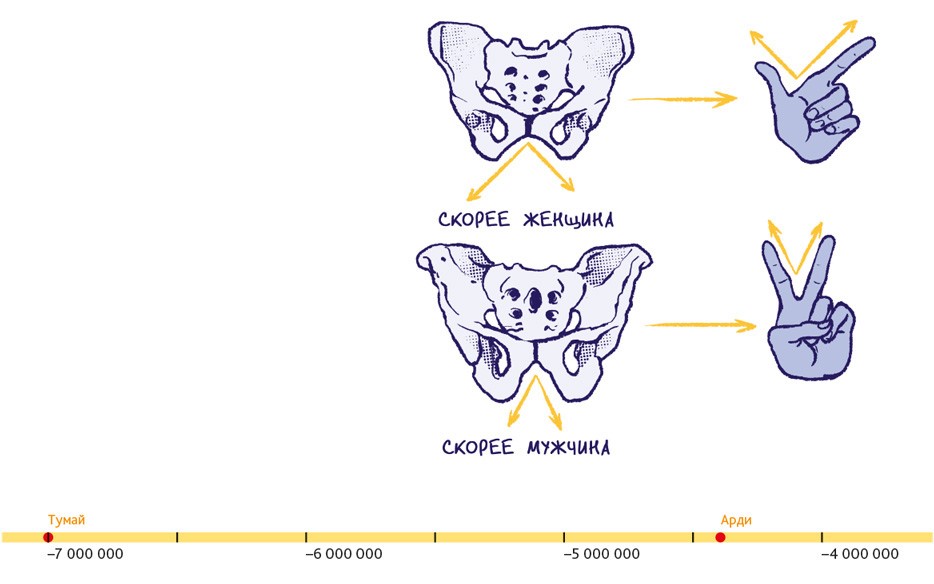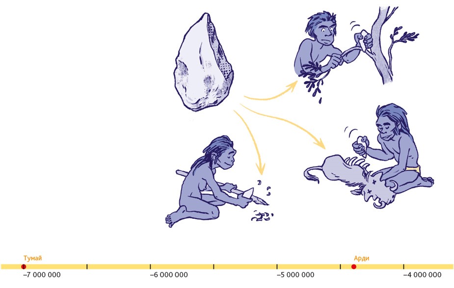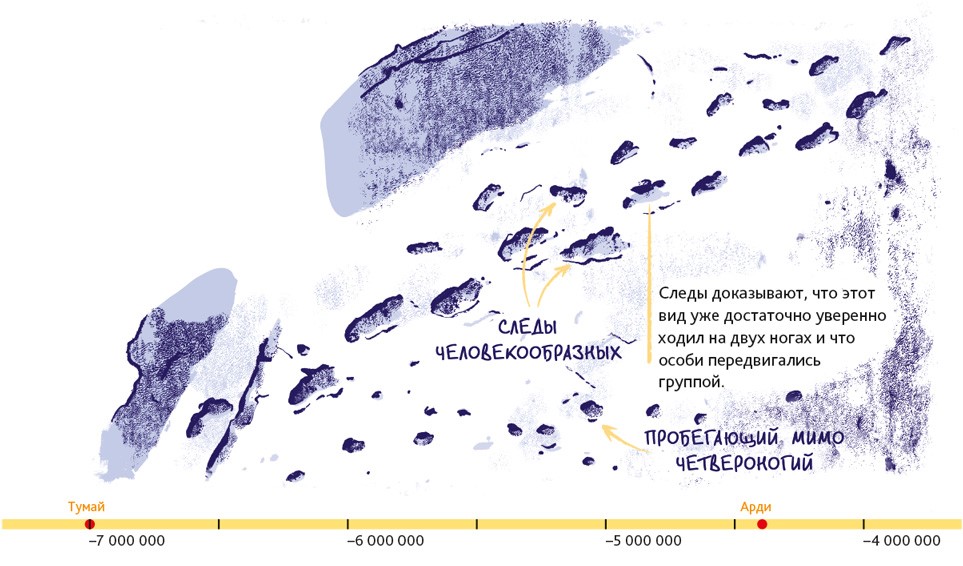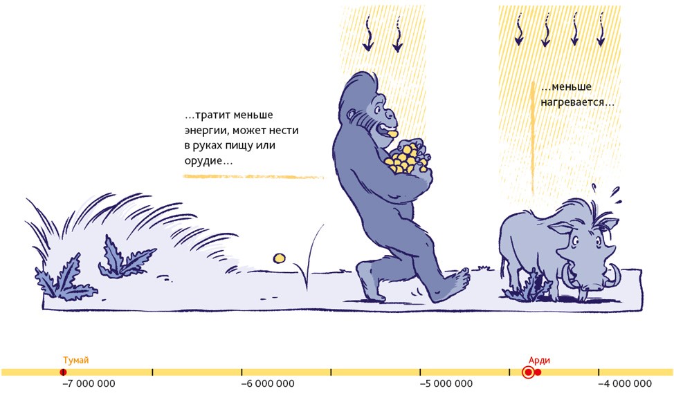 Процесс становления людей состоял из бесчисленного количества крошечных шажков в течение чрезвычайно долгого времени. Поэтому нельзя просто сказать: «Хоп! Вот теперь это совершенно точно люди». Тали навестила Тумай, потому что в ней проявляется, вероятно, первейшая и важнейшая человеческая особенность: скорее всего, Тумай частенько ходила на двух ногах. Но для формирования идеальной походки понадобилось ещё несколько миллионов лет. В течение этого времени скелет постепенно менялся, происходили значительные изменения в строении черепа, таза, ног и рук, кистей и ступней.