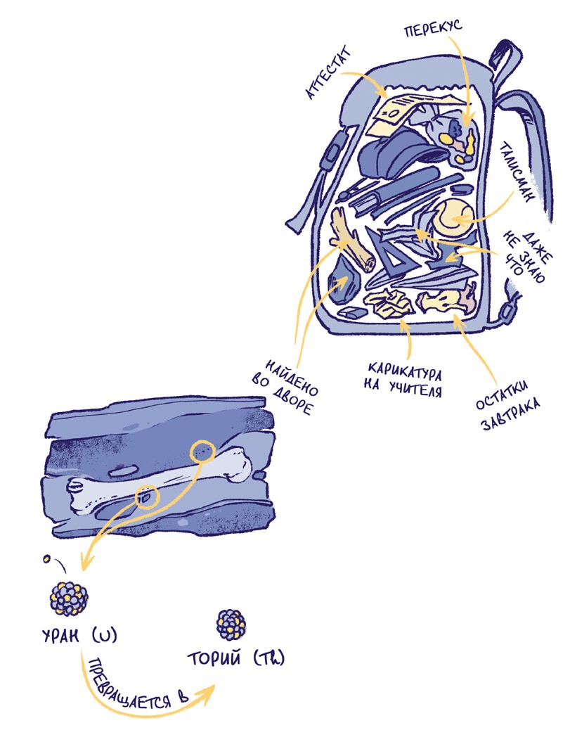Первые предположения о возрасте находки археологи могут сделать прямо на месте раскопок. Грубо говоря, чем глубже в земле обнаружена окаменелость, тем она древнее. Принцип тот же, что и с твоим рюкзаком: вещи, которые лежат на самом дне, находятся там гораздо дольше, чем те, что на самом верху. Почва со временем тоже приобретает всё новые и новые слои: ведь листья и пыль ложатся сверху. И если кость нашли в слое, возраст которого известен, то в идеальном случае кость пролежала там примерно столько же.