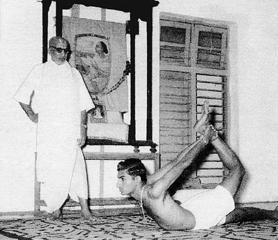 Кришнамачарья со своим сыном, Шрибхашьямом, демонстрирующим ардха-дханурасану.