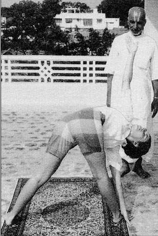 Кришнамачарья демонстрирует варианты экапада-урдхвапрасрита-падасаны.