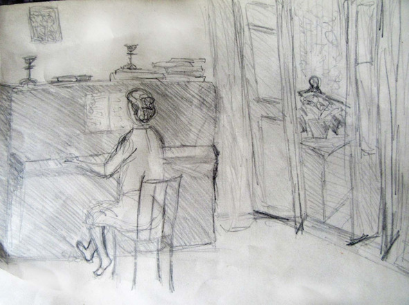 Тамара Михайловна за фортепьяно. 1986 (рисунок Грунтовой Оли, 12 лет)