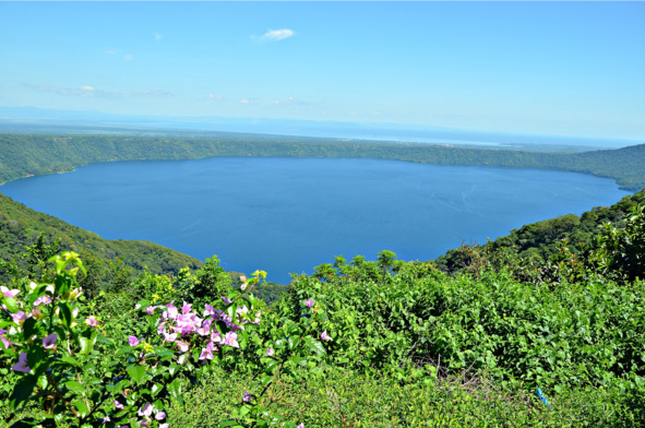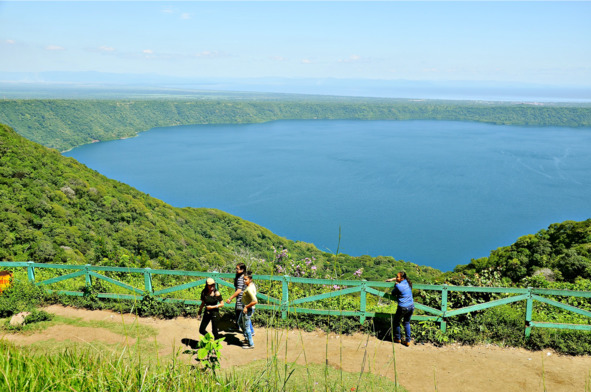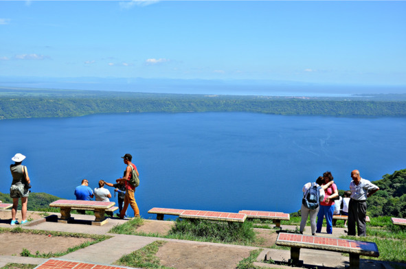 Оставалось пробыть последний день в стране моей молодости. Далеко ехать от Сан Маркоса, чтобы посмотреть что-то интересное, не имело смысла и отправилась я в маленькую деревню Никиноомо. Это там, за деревней, пройдя её насквозь, асфальтная дорога упирается в зелёные дебри и красной грунтовкой уходит дальше, вниз по склону к Лагуне де Апойо. Но ходить через лес к кратерному озеру в Никарагуа не рекомендуется в целях безопасности. Достаточно того, что я и так всю безлюдную дорогу крутила головой по сторонам, остерегаясь каждого приблизившегося ко мне человека. Да, когда-то приобретённые инстинкты остаются надолго, а это напряжение ещё то! По этой уважительной причине пришлось ограничиться смотровой площадкой, с которой лагуна полностью находилась в поле моего зрения. Чуть в стороне от лагуны дымился вулкан Масайя, а чёрный дым расстилался по небу. Горячий пепел красным отсветом раскрашивал выбросы.