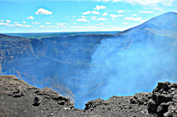 Дымит Сантьяго, конечно, на всю округу и вибрирует склонами. Само сопло очень глубокое – имеет какую-то притягательную, магическую силу. Оно неимоверно тянет к себе и хочется подойти к самому краю бездны. Каким-то странным образом здесь пропадает страх, лишь только неистовое желание смотреть вниз, а ещё желаннее приблизиться, овладевает чувствами.